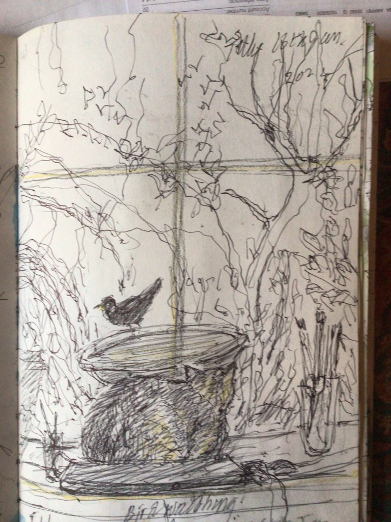 Staying indoors does not limit my subject matter though; I continue to take inspiration from the scenes through my window; my cat Tilly looking longingly at the blackbirds on the birdbath and the dramatic energy of Storm Isha.