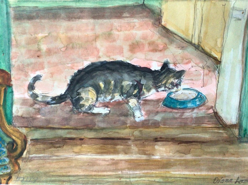 In the third piece, which is still in progress, you can see the foundations of what’s going to happen, and I will be referencing this little study of my cat Tilly eating in the kitchen.