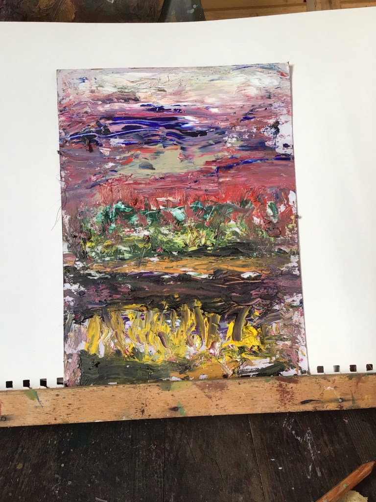 I don’t think I’ll ever be an abstract painter, but in these two pieces, I like Mondrian, have been inspired by nature and Norfolk’s flat landscapes, with its horizontal planes and layers. They were created using left over paint from previous pieces. I’ve always had a tendency not to waste paint, and when I use it memories come through and these memories are often tied to the landscape.